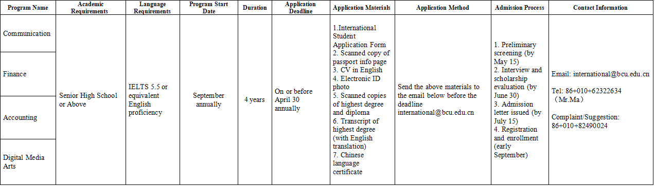 This program is open to international students with a high school diploma or higher qualifications. The program duration is four years, with instruction conducted entirely in English. Graduates will receive an undergraduate degree certificate and a Bachelor of Arts degree in Digital Media Arts from Beijing City University, as well as a Bachelor of Arts in Digital Film Design – Animation/VFX from the German partner institution.