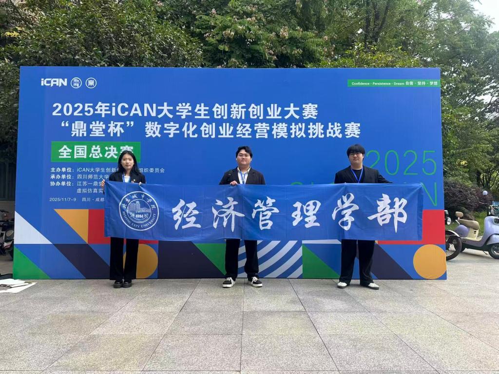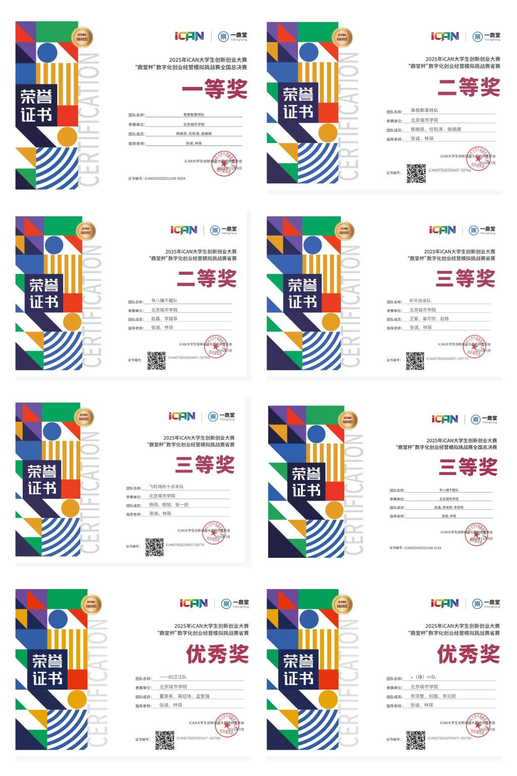 On December 15, the award ceremony for the 2025 iCAN National College Student Innovation & Entrepreneurship Competition – “Dingtang Cup” Digital Business Simulation Challenge concluded successfully. After eight months of competition across four rounds, a team from the School of Economics and Management at Beijing City University (BCU) stood out among more than 1,200 teams from over 200 universities nationwide, winning one First Prize and one Third Prize at the National Finals, as well as two Second Prizes, two Third Prizes, and two Merit Awards at the Provincial Level. Among them, the team of Yang Jimin, Ren Hetao, and Hou Jingjing was awarded the National First Prize for their differentiated competitive strategy and efficient operational management, while the team of Zhao Jing and Li Yafei received the National Third Prize for their innovative “online cross-border + offline experiential” business model. Faculty advisors Zhang Cheng and Lin Chen were honored as “Outstanding Instructors.”
