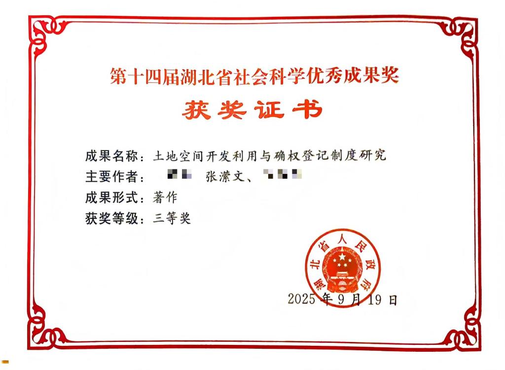 The Hubei Provincial Award for Outstanding Achievements in Social Sciences is a provincial-level award established by the People’s Government of Hubei Province. Awarded biennially, it is the highest honor in the field of social sciences in Hubei, recognized for its strong authority and academic influence. Zhang Yingwen’s award-winning work, Research on Land Space Development, Utilization, and Registration Systems (a monograph, ranked 2nd author), addresses local practical needs and integrates multidisciplinary perspectives to offer innovative approaches to the development, utilization, and governance of urban-rural land space. Key recommendations from the study have already informed and supported local administrative practices.