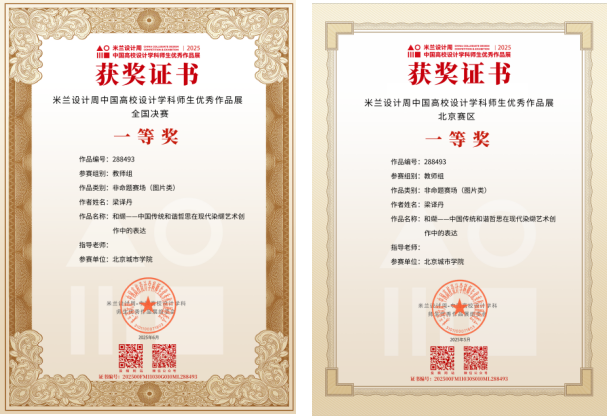 The national final award list for the faculty category of the 2025 Milan Design Week Chinese Universities Design Discipline Exhibition has been announced. Ms. Liang Yidan, a faculty member from the Communication Department of the School of International Culture and Communication at Beijing City University, was awarded the National First Prize in the Non-Themed Category (Fashion Design) and the Beijing Regional First Prize in the faculty group. Ms. Liang's award-winning work draws inspiration from the concept of "harmony" in traditional Chinese culture. Through contemporary design language, her creation revitalizes the vitality of traditional culture, emphasizing its inheritance and innovation.