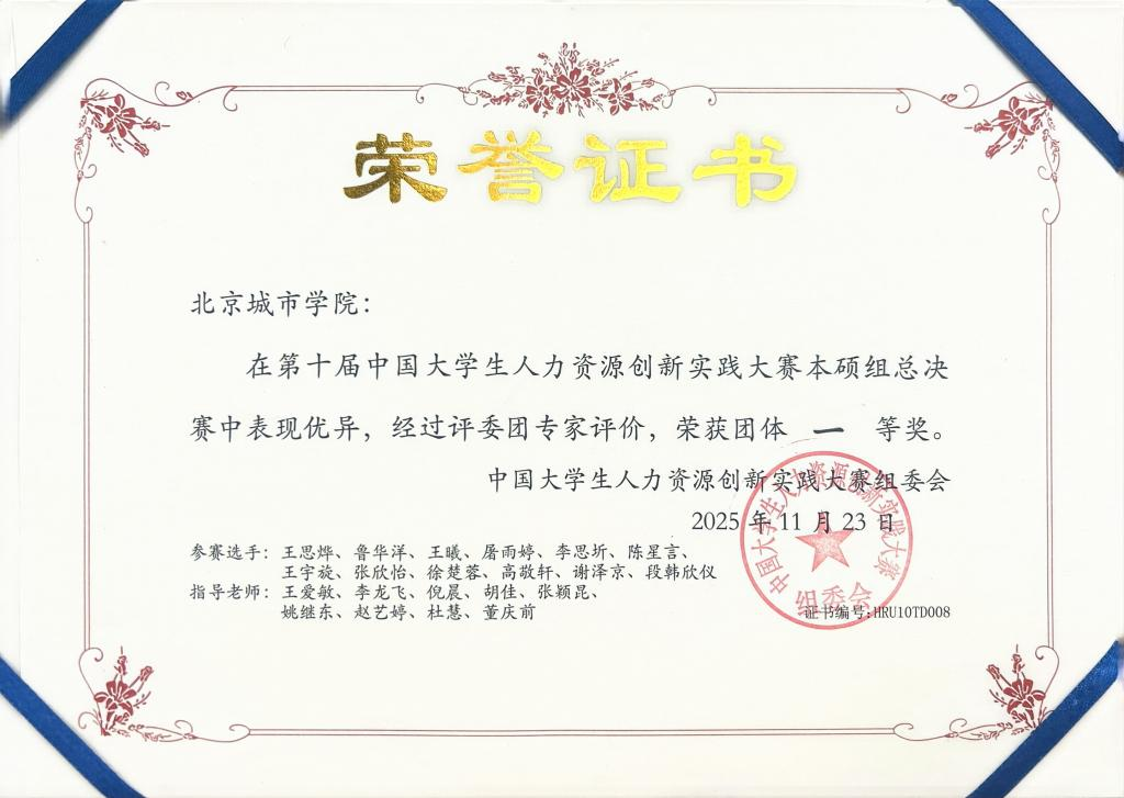 After intense competition, the 12 contestants from the Human Resource Management Major, School of Economics and Management of BCU, under the guidance of nine instructors, achieved outstanding results: they won the Special Prize in the Workplace Practice Track and the Labor Dispute Resolution Track, the First Prize in the Case Analysis Track, Practical Design Track, Leaderless Group Discussion Track, HR+Going Global Track, and HR+Employer Brand Track, as well as the First and Second Prizes in the Enterprise Trade Union and Enterprise Democratic Management (Enterprise Labor Dispute Mediation) Track, and the Second Prize in the HR+AI Track. Ultimately, BCU was awarded the Group First Prize.