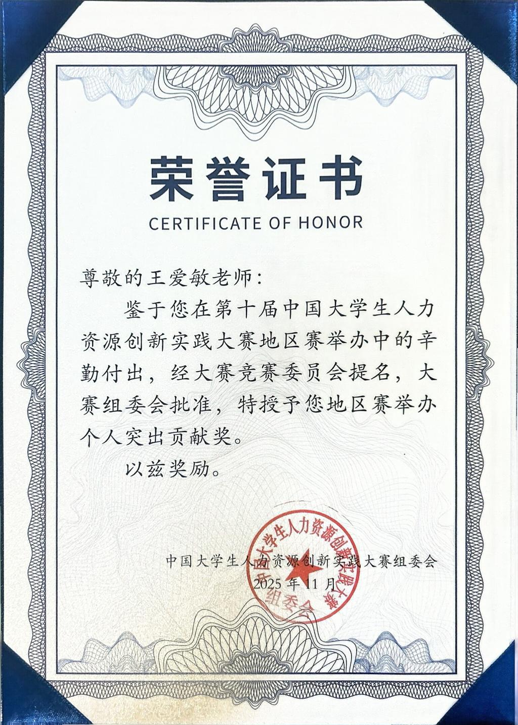The final of the 10th HRU Competition was co-organized by China Talent Exchange Association, China University of Labor Relations, and SDIC Human Resources Service Co., Ltd. (Guopin). Pro. Wang Aimin from the Department of Human Resources, School of Economics and Management of BCU was invited to the final as the Director of the Beijing-Tianjin-Hebei-Inner Mongolia-Shanxi Executive Committee and received the Individual Outstanding Contribution Award for organizing the regional competition.